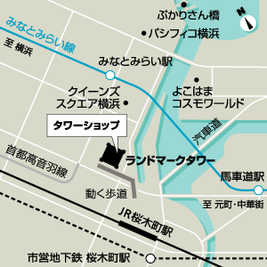 〒220-8169 横浜市西区みなとみらい 2-2-1 ランドマークタワー69F 展望フロア Tel. 045-222-5544 営業時間 10:00AM〜8:30PM (土曜日 10:00AM〜9:30PM) 年中無休 タワーショップへお越しの際は、 展望フロア入場料が別途かかります